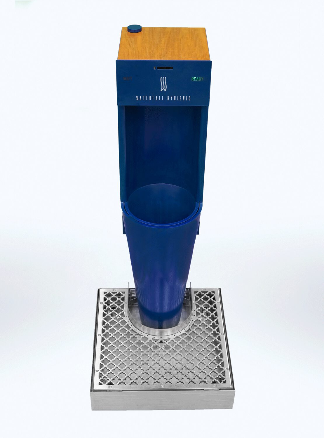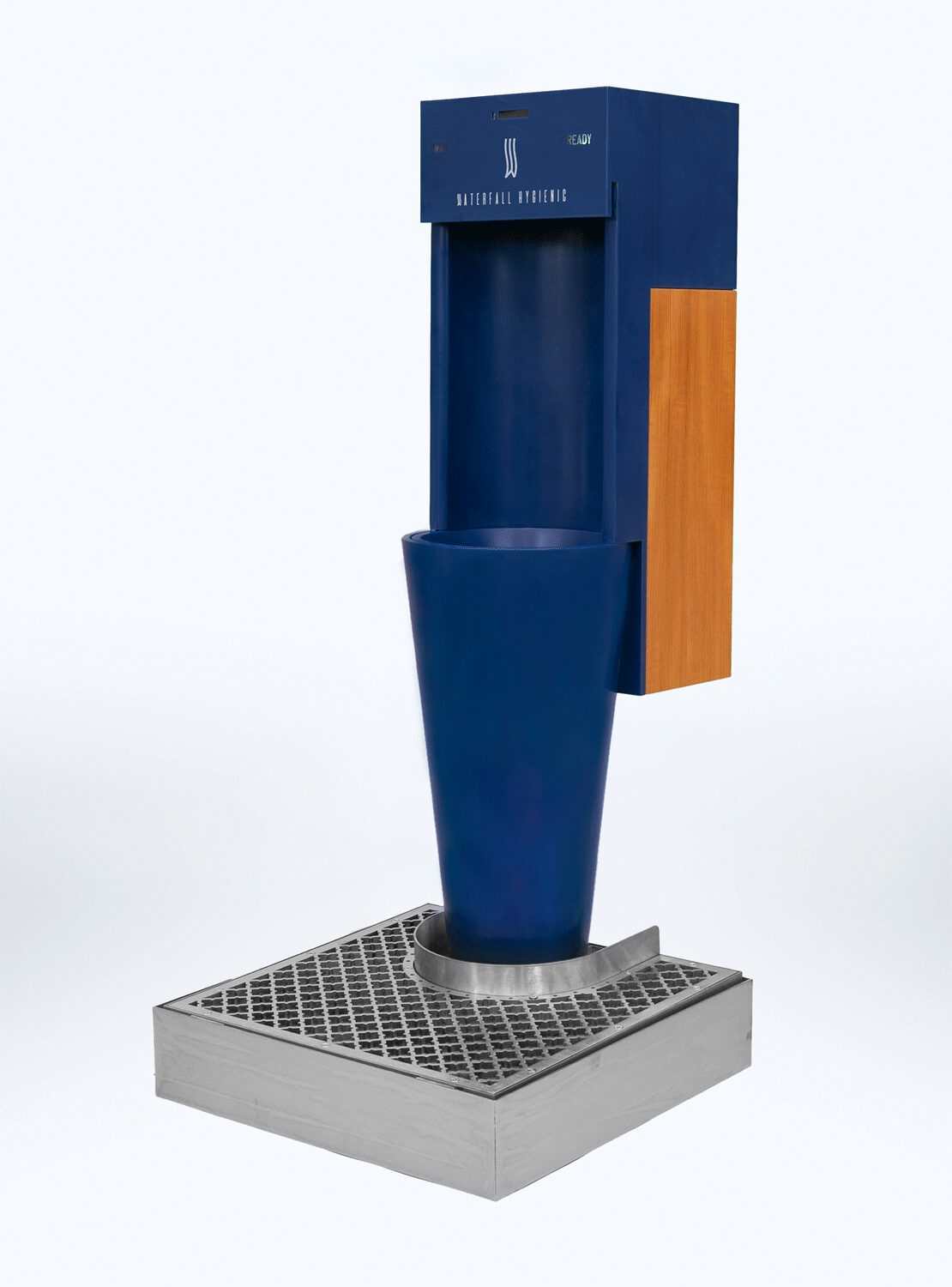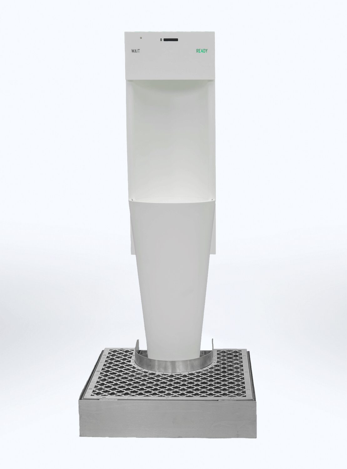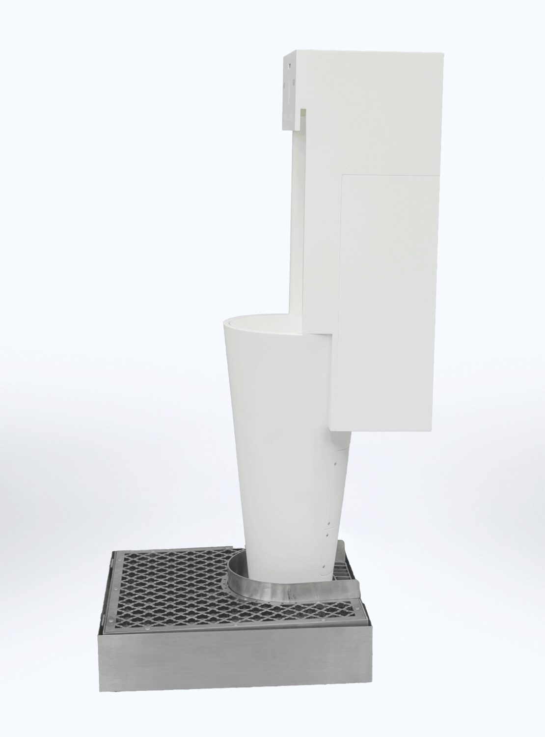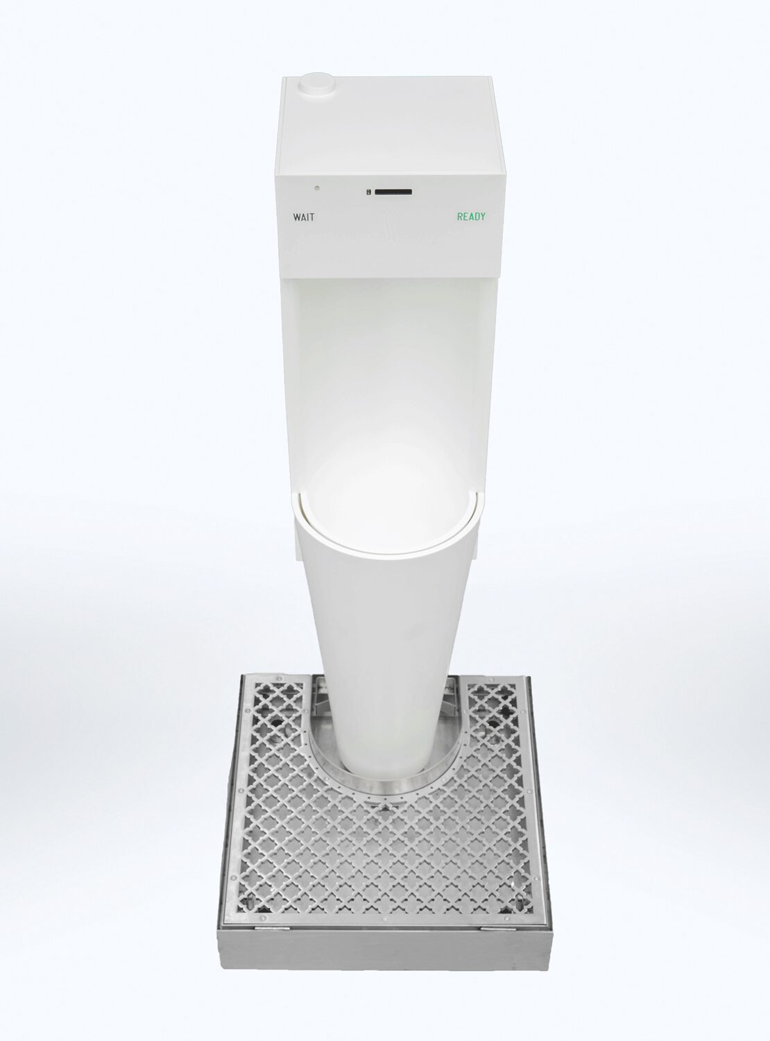 The grid at the base collects any splashes, which are conveyed into perfumed and sanitized water. Floor and user’s shoes are safe.