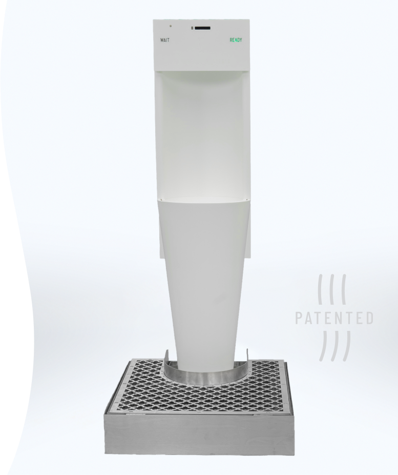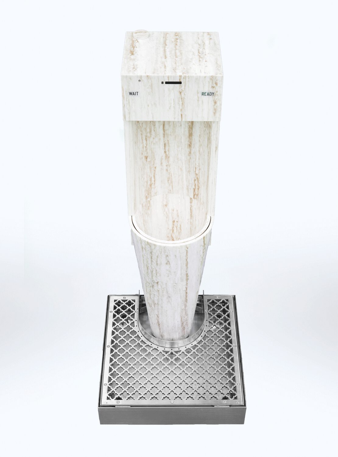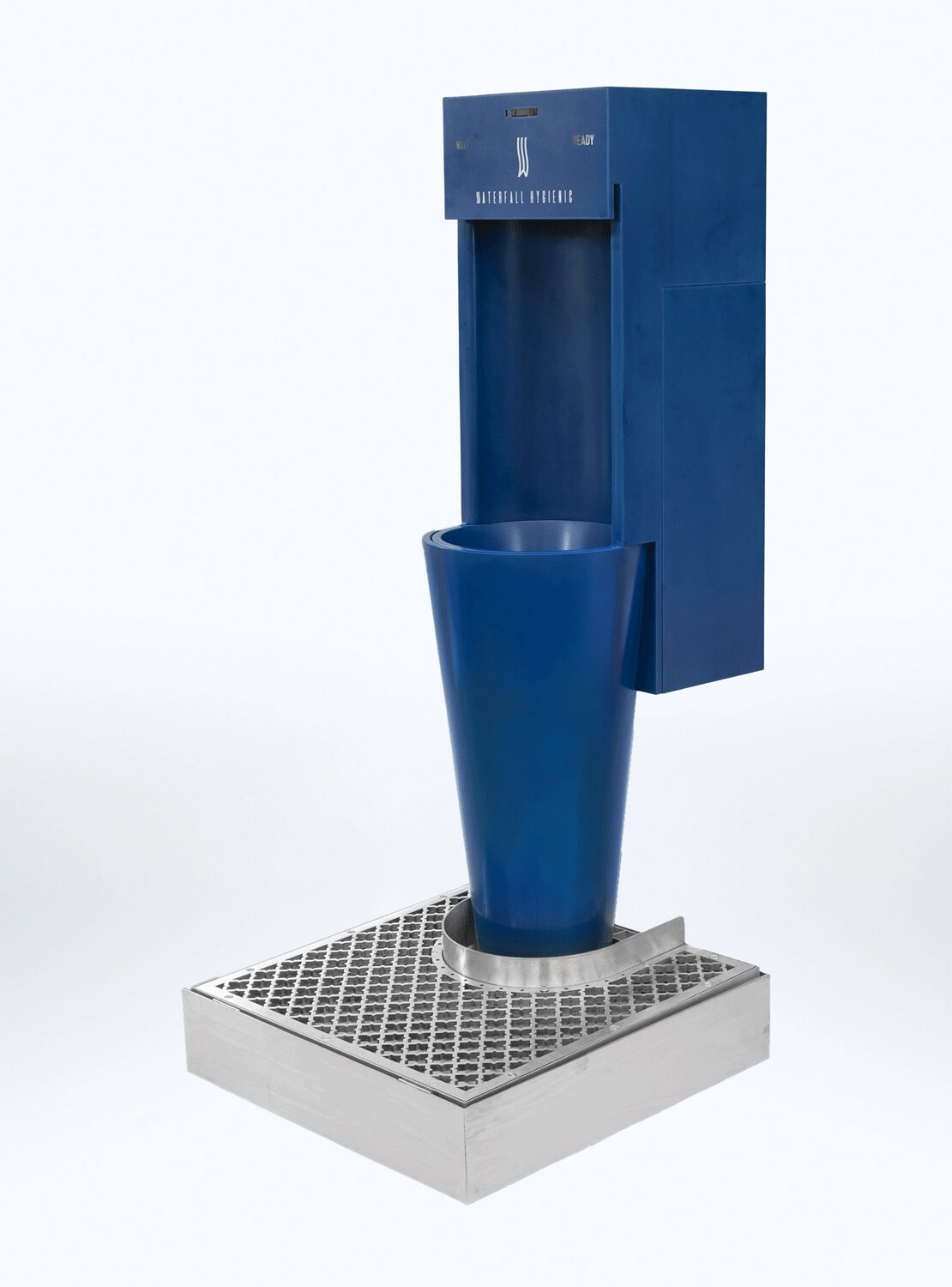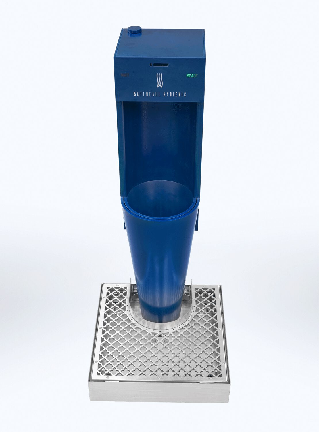 The grid at the base collects any splashes, which are conveyed into perfumed and sanitized water. Floor and user’s shoes are safe.
