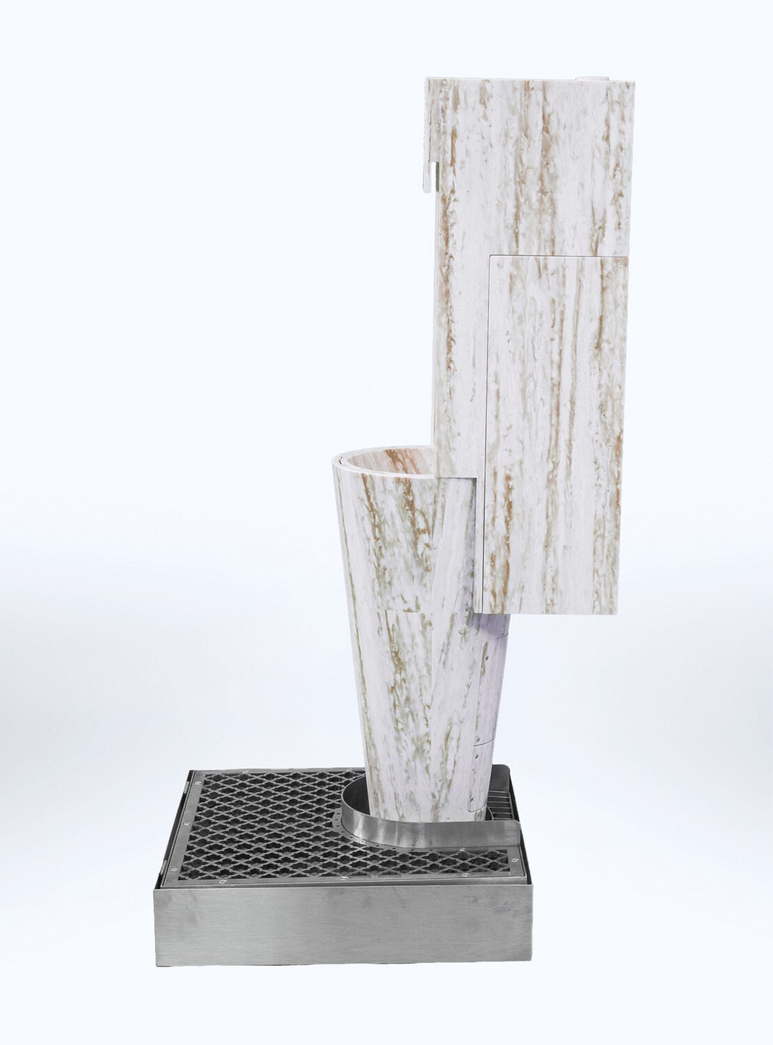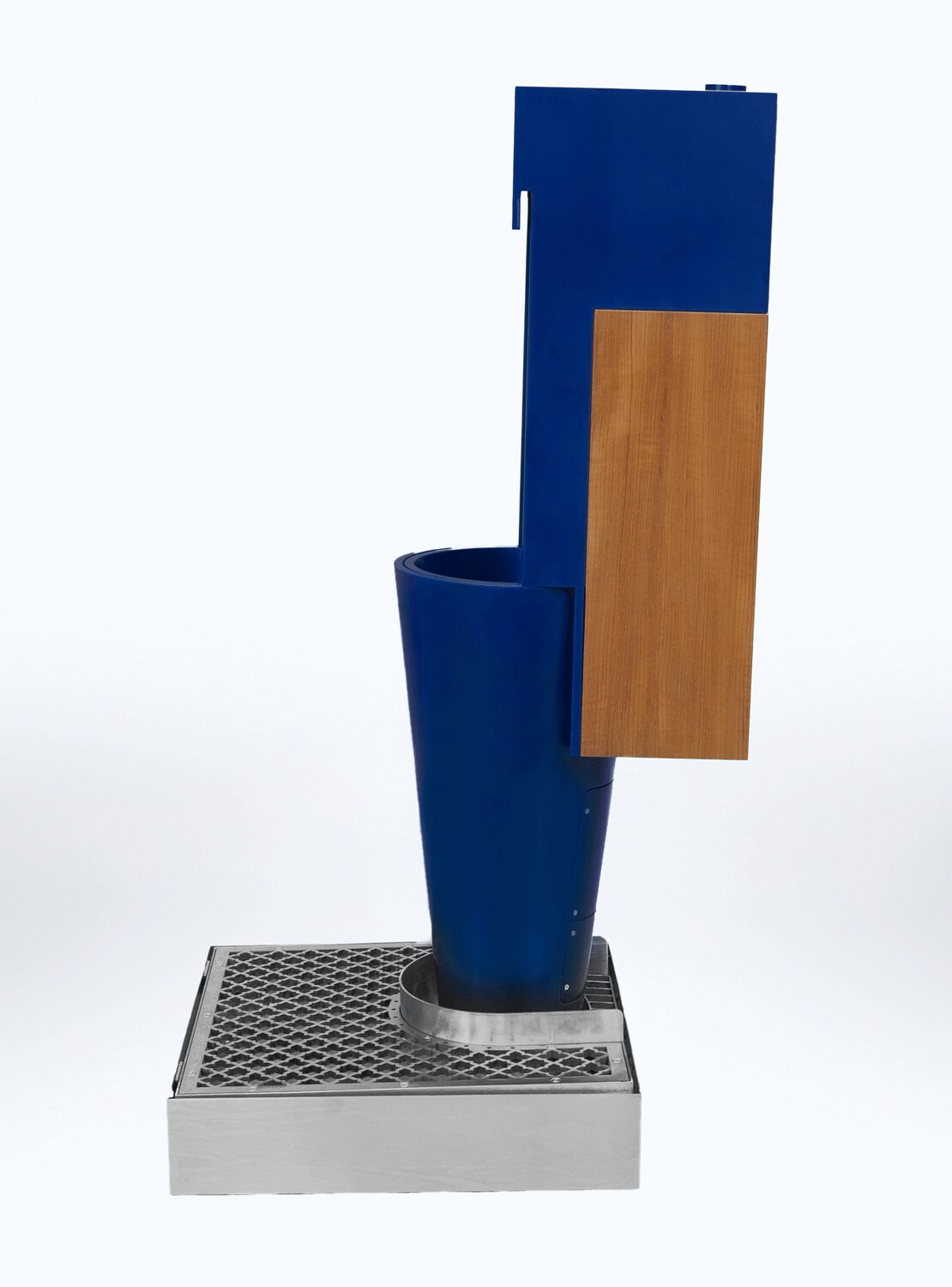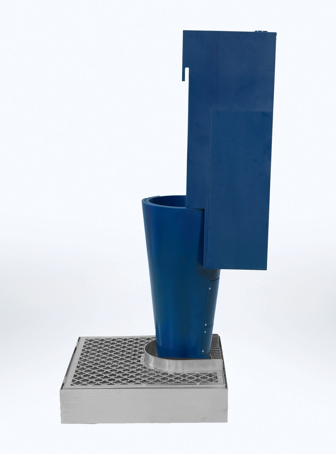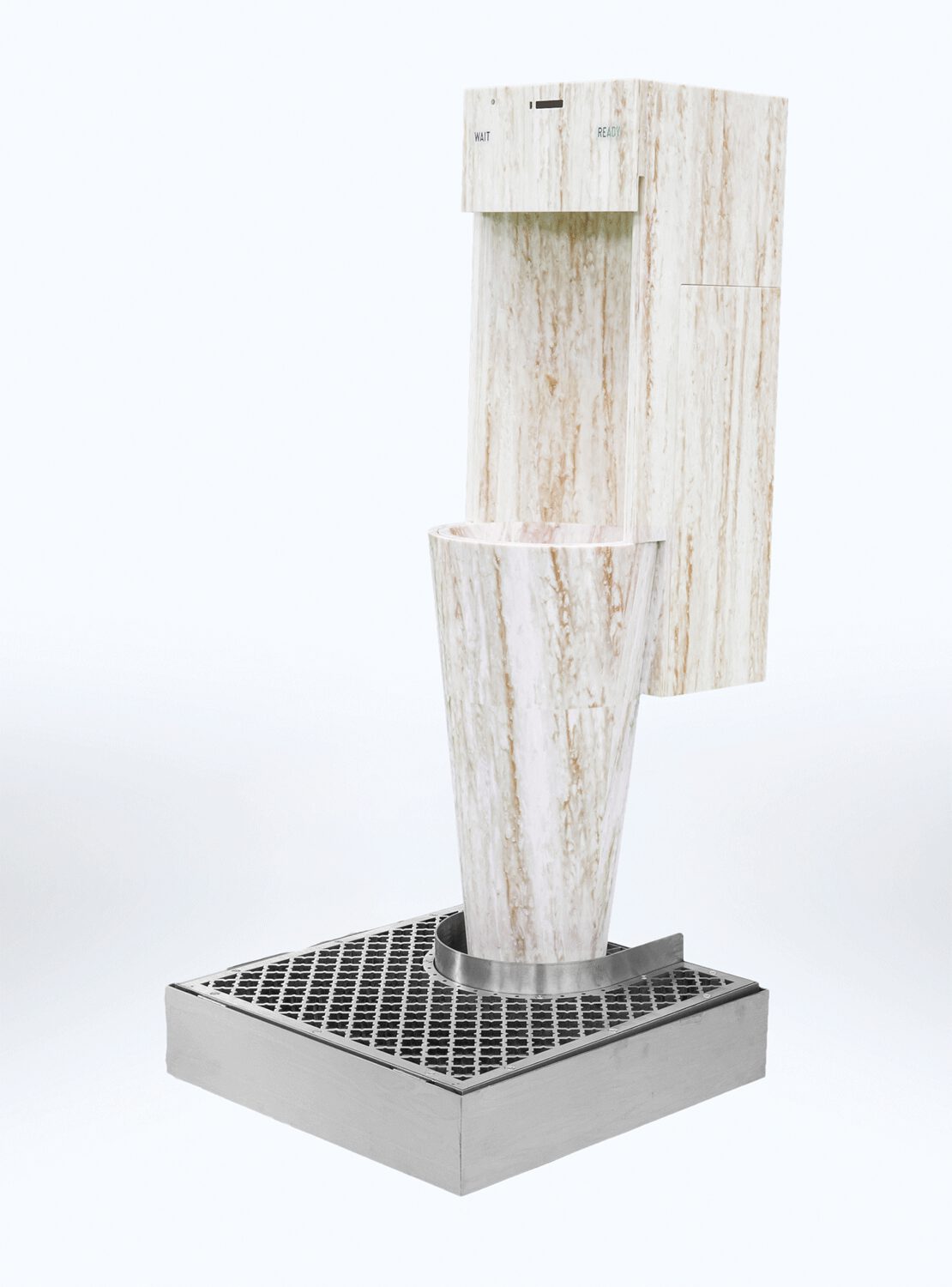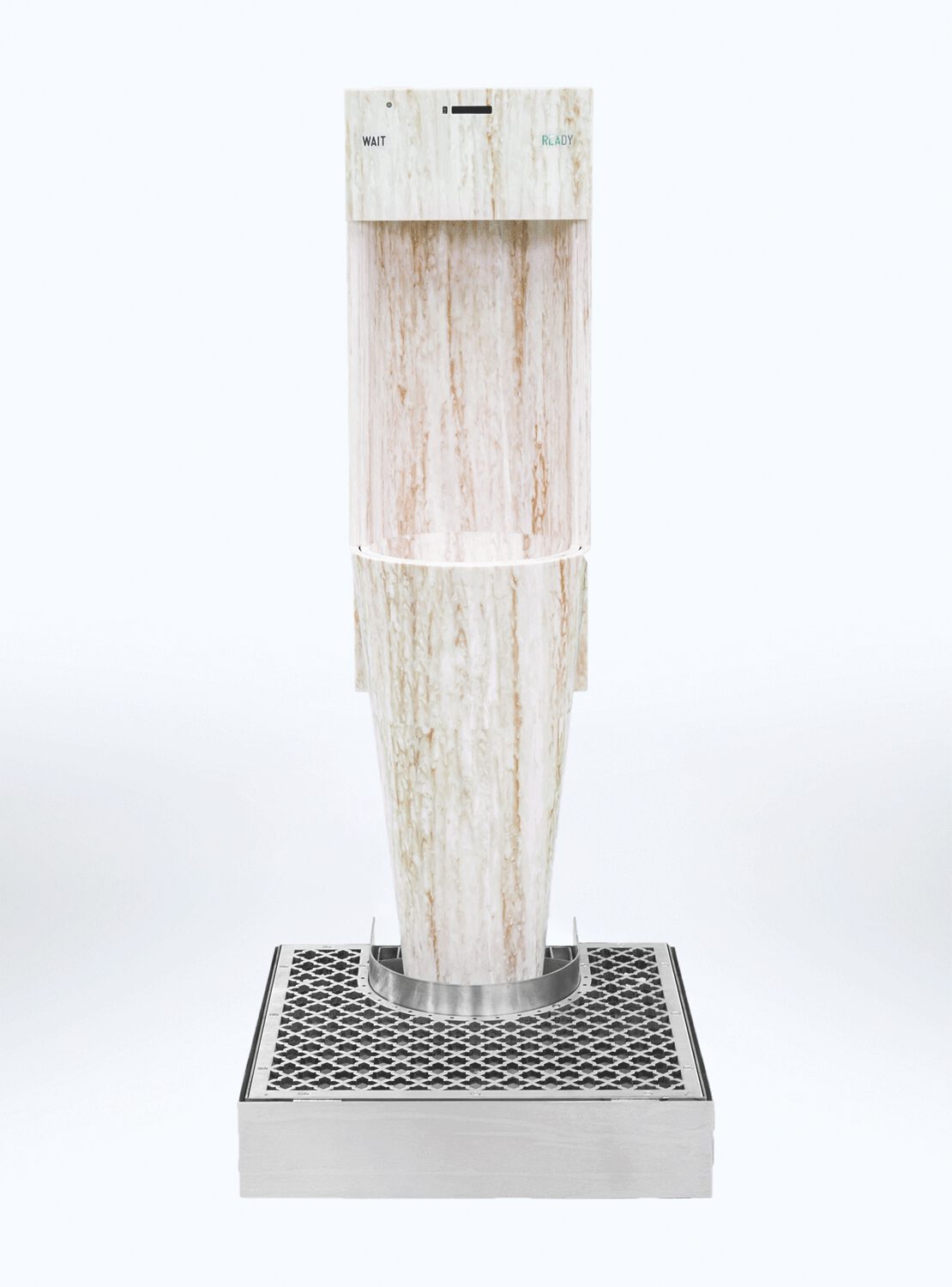 The grid at the base collects any splashes, which are conveyed into perfumed and sanitized water. Floor and user’s shoes are safe.